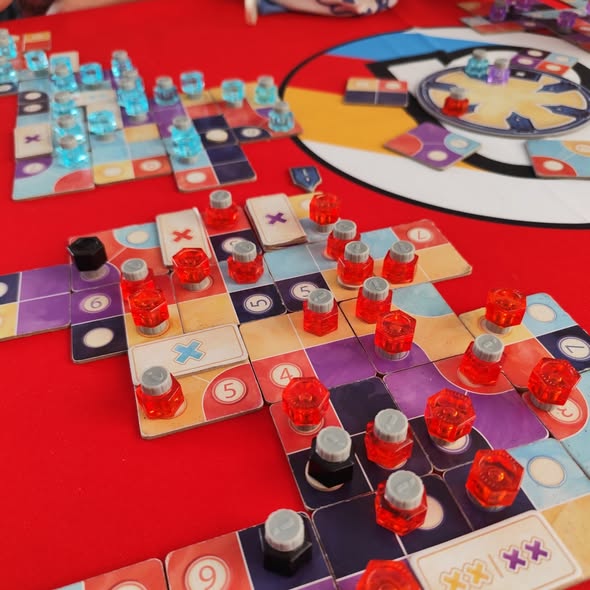 A votre tour, vous choisissez une carte afin d’agrandir votre « tableau/domaine ». Si une zone rouge contenant un « 4 » est constituée d’au moins 4 cases rouges, vous pourrez poser un ou plusieurs de vos encriers, le but étant de ne plus avoir d’encrier du tout.