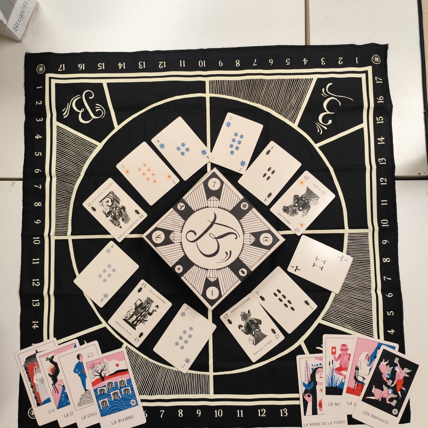 je serais peut être la seule à avoir été séduite par ce jeu à base de scopa. Deux fois l’auteur me l’a présenté et les deux fois j’ai eu envie d’y jouer. Pourquoi ? Parceque cela reprend le principe simple de la scopa : avec un 7 je peux récupérer des cartes dont la somme fait 7. Mais ici, selon la partie du plateau sur laquelle vous jouez vous aller poser des cartes, récupérer des cartes… Bref c’est plus technique. Le matériel est très beau. Laissez moi y jouer pour vous convaincre !